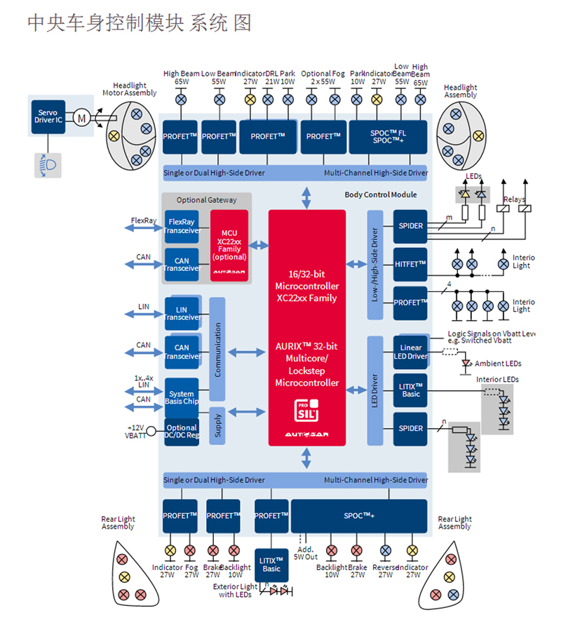 车载网络的复杂性催生了针对具体应用领域的多种总线标准和协议,包括以太网、FlexRay、CAN、LIN和 MOST®。中央网关担负起这些通信方式之间的信息桥梁。