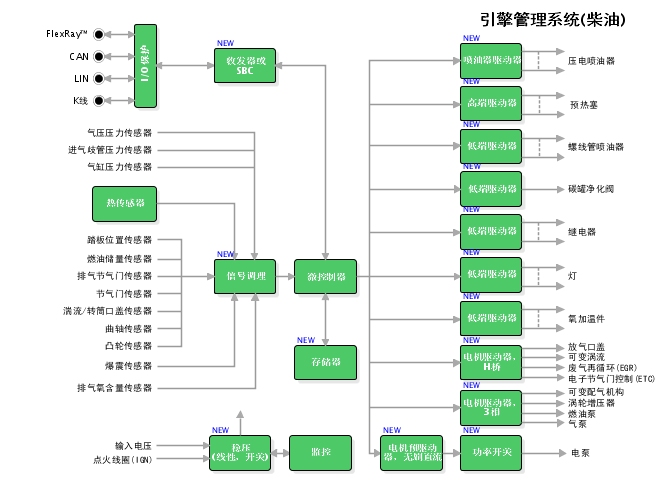 汽车引擎管理系统是指发动机管理系统,(Engine Management System,简称EMS),EMS采用各种传感器,把发动机吸入空气量、冷却水温度、发动机转速与加减速等状况转换成电信号,送入控制器。控制器将这些信息与储存信息比较,精确计算后输出控制信号。EMS不仅可以精确控制燃油供给量,以取代传统的化油器,而且可以控制点火提前角和怠速空气流量等,极大地提高了发动机性能。