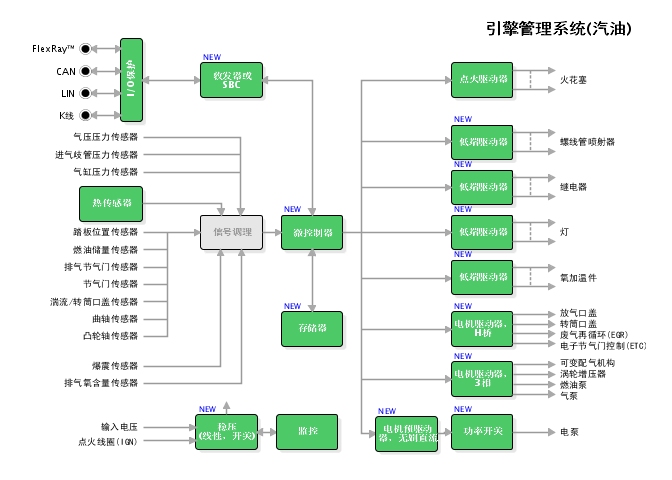 汽车引擎管理系统是指发动机管理系统,(Engine Management System,简称EMS),EMS采用各种传感器,把发动机吸入空气量、冷却水温度、发动机转速与加减速等状况转换成电信号,送入控制器。控制器将这些信息与储存信息比较,精确计算后输出控制信号。EMS不仅可以精确控制燃油供给量,以取代传统的化油器,而且可以控制点火提前角和怠速空气流量等,极大地提高了发动机性能。